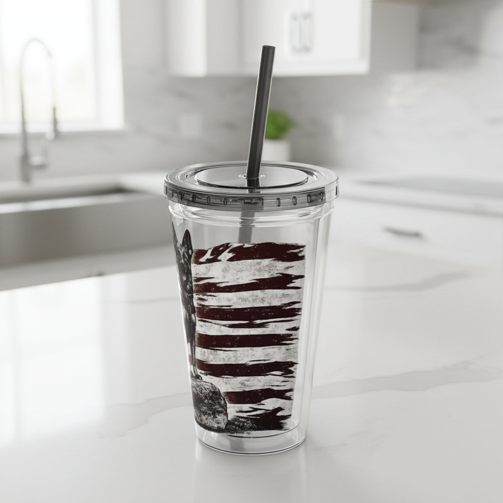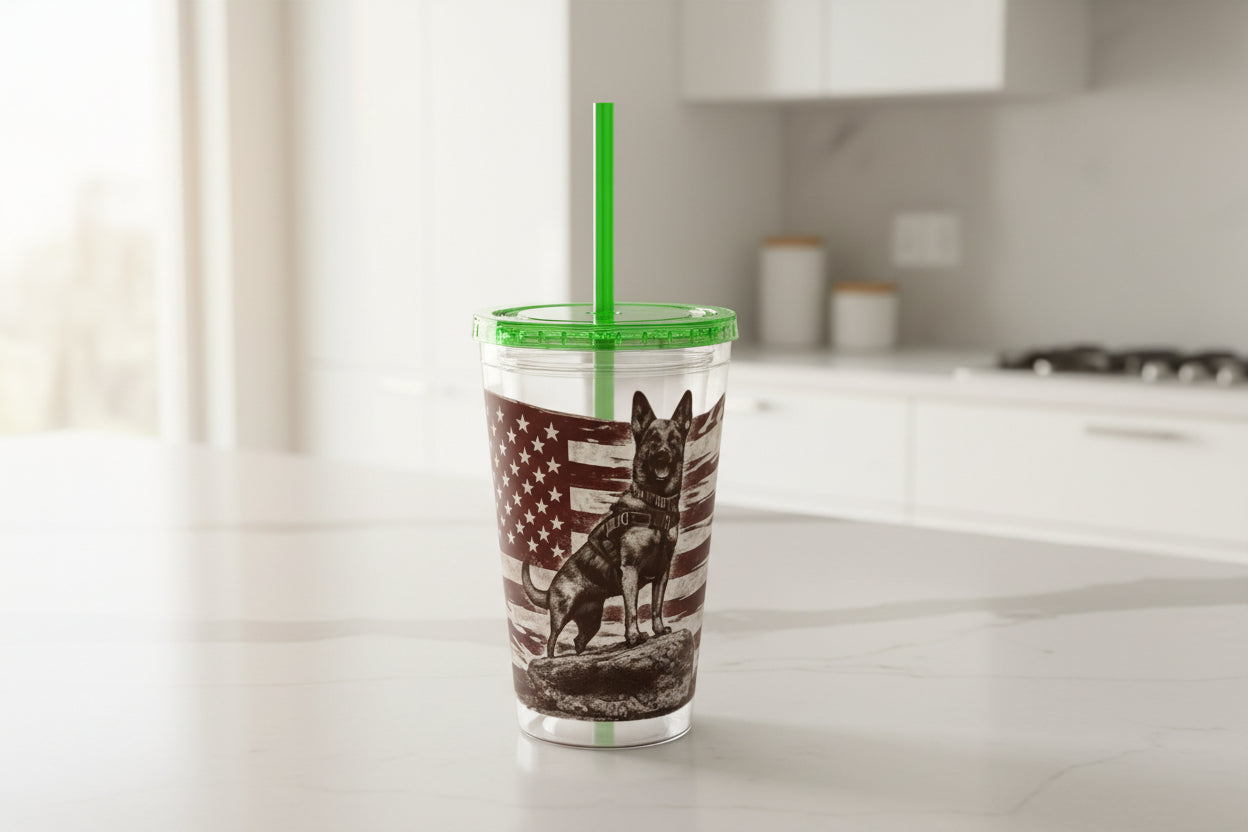 A 16oz double-wall acrylic tumbler built for days on the move. The clear body showcases bold, high-contrast artwork — an alert working dog standing proud against a distressed American flag — while a color-matched lid and crack-resistant straw finish the look. The insulation minimizes condensation and keeps temperatures steady for both hot and cold drinks. Durable, BPA-free construction and vivid print quality mean this tumbler holds up to everyday use and still looks striking at the trailhead, in the squad room, or at your kitchen counter.